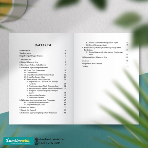 Buku ini hadir untuk memberikan penjelasan mengenai duka sebagai hakikat dari keberadaan kita di dalam samsara, asal-mula duka, lenyapnya duka, dan jalan menuju lenyapnya duka dengan merenungkan kematian, mengenai karma dan klesha, serta mengatasi kemelekatan. Pada akhirnya, perenungan topik Empat Kebenaran Arya tidak hanya akan membangkitkan tekad untuk senantiasa menumbuhkan faktor mental bajik, tetapi juga mendorong kita menjadi sosok berkapasitas sempurna yang mampu membebaskan semua makhluk dari penderitaan.